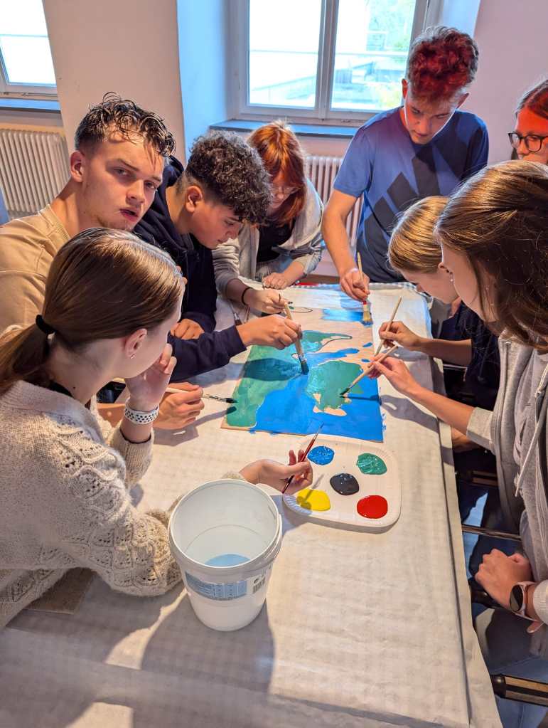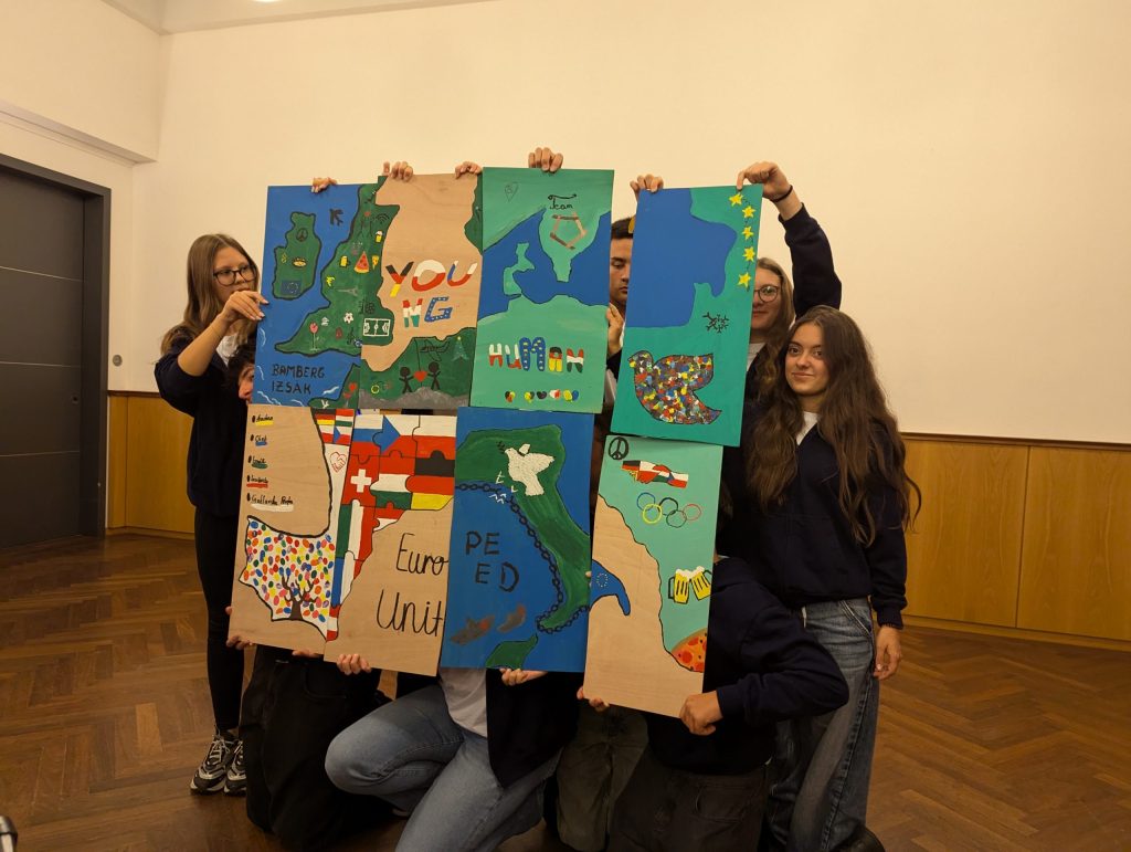 Eine tolle Aktion in Bamberg war „Mein Bild von Europa“. In verschiedenen gemischten Gruppen sollten die Jugendlichen „ihr Bild von Europa“ malen. Jede Gruppe erhielt dafür ein Teilstück von Europa, vorgezeichnet auf ein großes Holzbrett, und musste sich nun überlegen, wie ihr Bild von Europa denn nun aussieht. Es ging nicht darum, auf ein Stück von Italien eine Pizza oder das Kolosseum zu malen, sondern um ihr persönliches Gefühl von Europa. Miteinander in den Austausch zu gehen, war da schon einmal die erste Hürde. Ein Sprachenwirrwarr aus deutsch, polnisch, ungarisch, tschechisch und englisch war die Folge, teilweise musste man sich auch mit Händen und Füßen behelfen. Ein kleiner Schritt zur Annäherung über sprachliche Barrieren hinweg. Bei der Vorstellung der Ergebnisse am letzten Tag haben die Jugendlichen sehr schön erzählt, was sie mit Europa verbinden. Entstanden ist aus den 8 Puzzleteilen ein großes Bild mit den Umrissen von Europa. Darauf war beispielsweise die Friedenstaube zu sehen oder gesprengte Ketten, sich an den Händen haltende Menschen oder fliegende Vögel, die jede Grenze einfach überfliegen. Frieden, Freundschaft, Freiheit, das waren Schlagwörter, die bei den Erläuterungen der Jugendlichen immer wieder auftauchten.